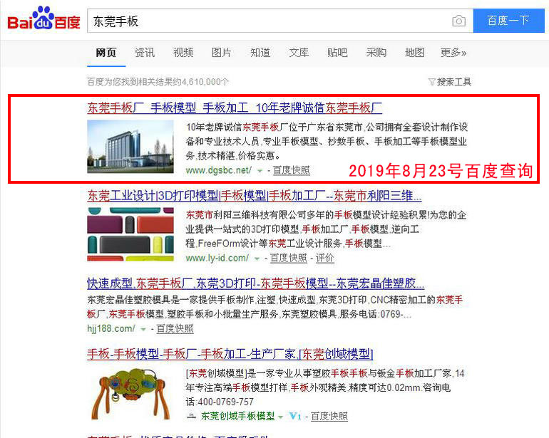 東莞手板廠 : 2019-02-28上線    2019-03-05百度第18名    2019-03-19百度第8名    2019-03-25百度第2名(排名第1名的網站www.dgsbc.net也是我公司管理優化的網站)